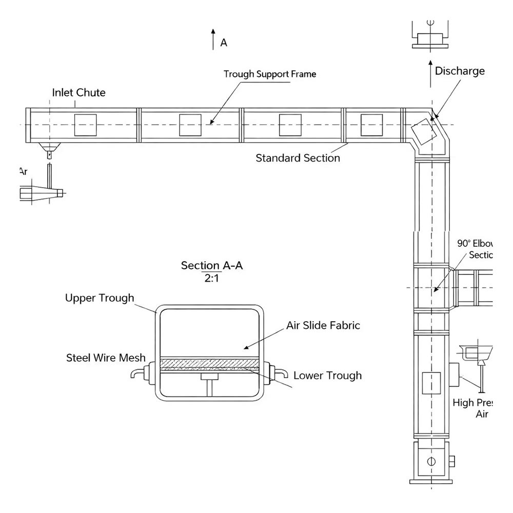 The system mainly consists of an upper chute, air slide fabrics, and a lower chute. Compressed air is supplied into the lower chute, passes through the air slide fabrics, and fluidizes the dry powder or granular materials on the upper chute. Driven by gravity, the fluidized materials flow toward the lower section of the system, completing the conveying process.