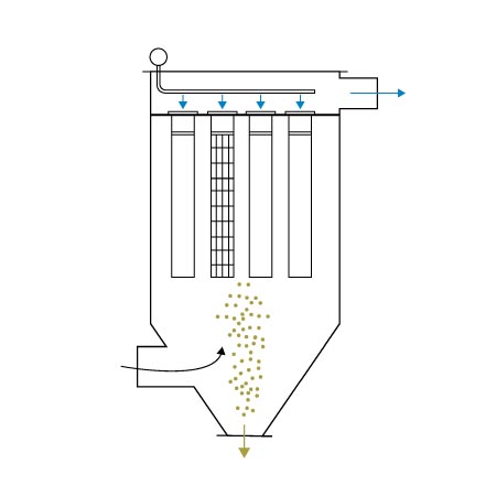Las bolsas filtrantes se suspenden de la parte superior de la unidad y se conectan a la placa tubular en la parte inferior. El aire a filtrar entra por la parte inferior, fluye hacia arriba a través de las bolsas filtrantes y sale por la parte superior, capturando los contaminantes.